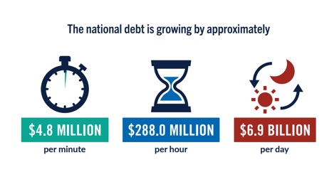 The nation is currently adding $6.9 billion every day, $288 million every hour, $4.8 million every minute, and roughly $80,000 every second.